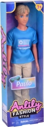 La bambola Paulo di Anlily si distingue per l'aspetto moderno, i capelli biondi e gli occhi azzurri. È vestito con una elegante maglietta blu con stampa e pantaloni lunghi beige, abbinati a scarpe marroni. Grazie agli arti snodati è ideale per pose realistiche e piccole scenette.