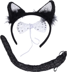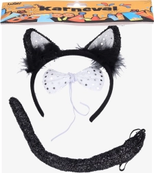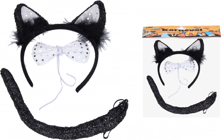 Elegante set da carnevale per gli amanti dei gatti che include tutto il necessario per una trasformazione rapida. Troverai un cerchietto con orecchie da gatto, un papillon e una coda – ideale per carnevali, balli in maschera e feste a tema.