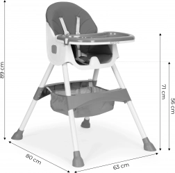 Il vassoio ampio con bordi rialzati e portabicchiere ha due strati: per i pasti e per il gioco. Quello superiore si rimuove facilmente e si può lavare in lavastoviglie; la distanza dal bambino è regolabile su 3 posizioni.