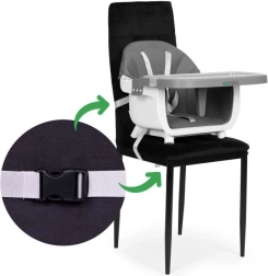 La variante 2 in 1 permette di rimuovere le gambe e fissare la seduta con cinghie a una sedia normale: ideale in viaggio e per l’uso a tavola in sala da pranzo.