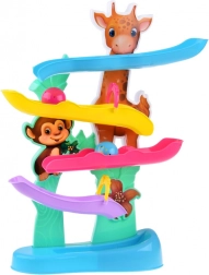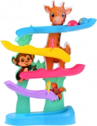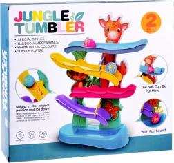 Questa colorata pista a biglie ispirata alla giungla offre ai bambini la gioia di osservare il movimento e di scoprire. Quattro rampe dai colori vivaci guidano le biglie verso il basso, dove li attendono suoni di animali ed effetti di tamburo che li motivano ancora di più al gioco.