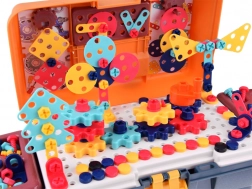 Questo set riccamente accessoriato per piccoli maestri trasforma ogni stanza in un laboratorio creativo. La valigetta richiudibile funge sia da pratico contenitore sia da piano di lavoro: la piastra perforata consente il fissaggio stabile di viti, dadi ed elementi, grazie ai quali i bambini possono assemblare auto, elicotteri, animaletti e strutture mobili con ingranaggi.