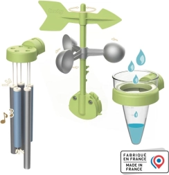 Trasforma la casetta dei bambini in una piccola stazione meteorologica. Questo set ludico-didattico stimola curiosità e abilità pratiche: i bambini possono osservare direzione e velocità del vento, misurare le precipitazioni e, al contempo, percepire l’ambiente circostante grazie ai delicati toni del carillon a vento.