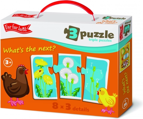 Puzzle terzetto Far Far Land: 8 immagini con 3 pezzi per bambini. Sviluppa logica e abilità motorie. Ideale per un apprendimento gioioso.