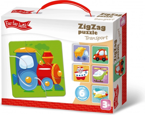 Far Far Land Puzzle ZigZag porta un divertente tema di trasporto con sei immagini splendidamente colorate. Il taglio speciale a zigzag assicura che il gioco sia ancora più divertente e sviluppa la logica e le abilità motorie dei bambini.