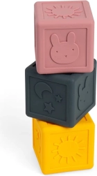 Scoprite la magia dei cubi sensoriali in silicone, ideali per il gioco e per lo sviluppo dei sensi del vostro bambino. Ognuno dei tre cubi nel set presenta un esclusivo design in rilievo con motivi come coniglietto, sole e stelle, che incoraggiano la percezione sensoriale e l'esplorazione tattile. Questi cubi non solo favoriscono la manualità e la coordinazione mano-occhio, ma fungono anche da bellissima decorazione per la cameretta.