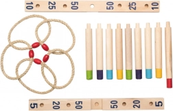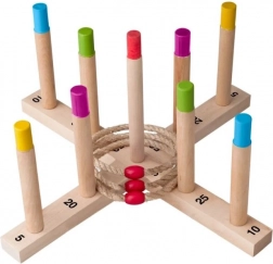 Prova il divertimento con il gioco in legno con lancio di anelli. L'obiettivo è lanciare cinque anelli di corda intrecciata su una croce di legno con pioli per ottenere più punti possibile. Questo gioco è perfetto per sviluppare destrezza, pazienza e concentrazione. Il gioco include: