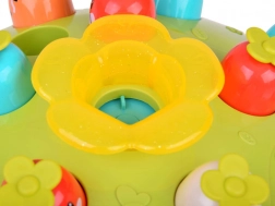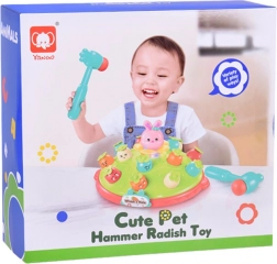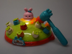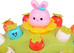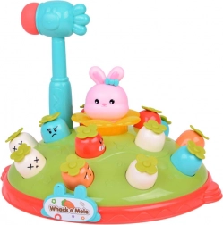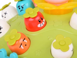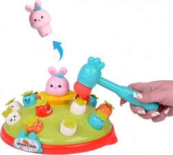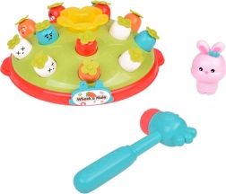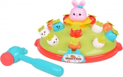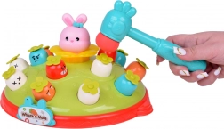 Il gioco Colpisci col martelletto offre ai bambini l'opportunità di sviluppare le loro abilità motorie in un ambiente divertente. Sulla piattaforma colorata che ricorda un prato sono posizionate carotine di diversi colori ed espressioni insieme al coniglietto rosa, il cui scopo è saltare quando colpito con il martelletto. Il gioco è accompagnato da una melodia allegra che cattura l'attenzione dei bambini. La piattaforma comprende due livelli di carotine e un ingegnoso meccanismo che, girando il coniglietto, fa saltare una carota diversa dal livello superiore.