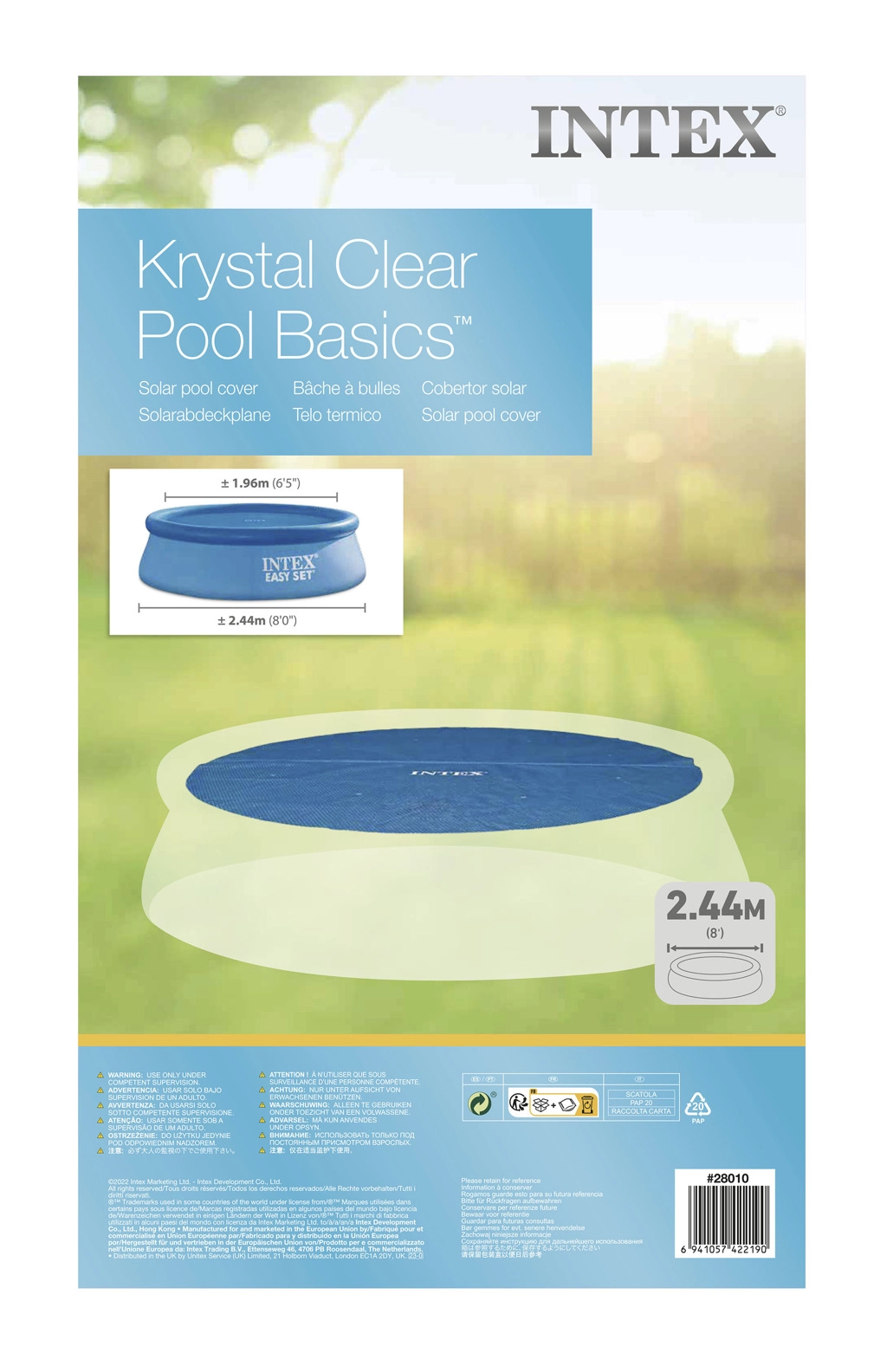 Pratica copertura solare INTEX per piscine rotonde con diametro di 244 cm che aiuta a riscaldare e mantenere la temperatura dell’acqua, riduce le perdite di calore grazie allo strato isolante e allo stesso tempo protegge la superficie da impurità. Grazie alla struttura a bolle sfrutta efficacemente l’energia solare ed è adatta a piscine con telaio e autoportanti.