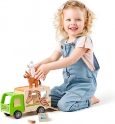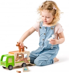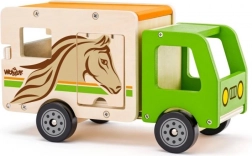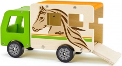 Questo camion trasporta cavalli in legno, realizzato con cura, offre ai bambini un divertimento realistico. La cabina verde, l'aspetto naturale del legno e la stampa con cavalli creano un design accattivante che invita a storie di fattoria e di ippodromo. La rampa ribaltabile facilita il carico dei cavalli e la struttura robusta resiste al gioco quotidiano.