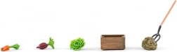 Una cassetta, verdure e un forcone arricchiscono il gioco con elementi di raccolto e alimentazione. I bambini possono esercitare la motricità fine ordinando e trasportando.