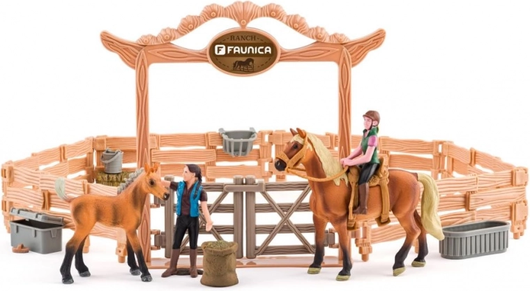 La confezione include tutto il necessario: cavalli, figurine, recinto e accessori per l'alimentazione. Punto di partenza ideale nel mondo dell'equitazione e del gioco in fattoria.