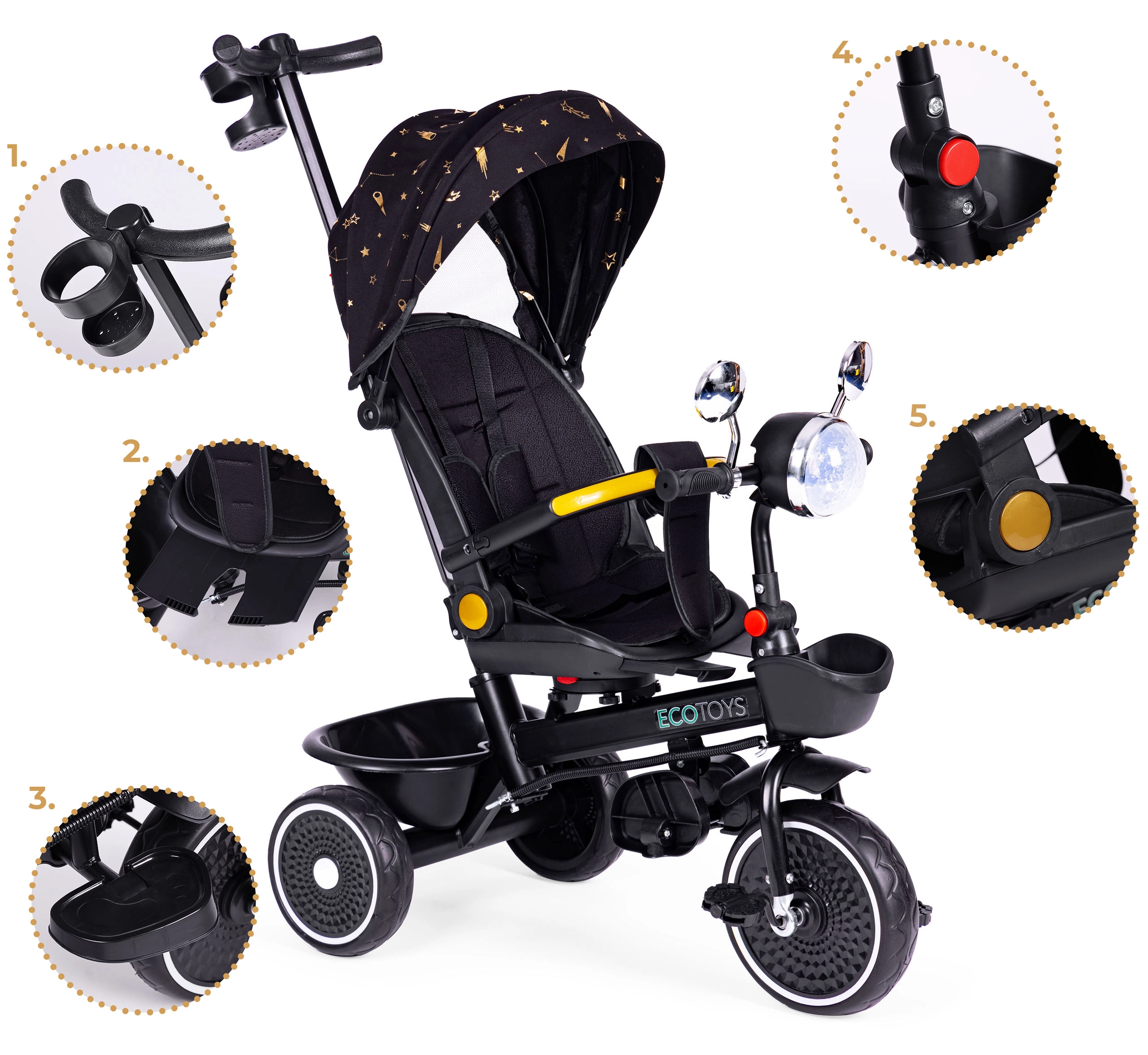 Il triciclo multifunzionale per bambini ECOTOYS cresce con il tuo bambino da 6 mesi a 6 anni. Offre un sedile girevole a 360°, una asta di guida per i genitori, una cappottina pieghevole e cinture di sicurezza e corrimano. Grazie alla robusta struttura in acciaio, alle ruote in EVA e agli accessori pratici (luce con melodie, portabevande, cestini portaoggetti) garantisce comfort, sicurezza e divertimento a ogni passeggiata.