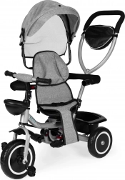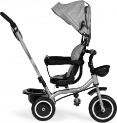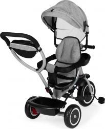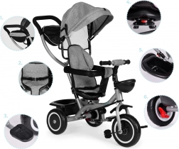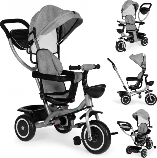 Il triciclo ECOTOYS cresce con il tuo bambino: dalle prime uscite con guida parentale fino alla pedalata autonoma. Il sedile girevole consente di viaggiare fronte genitore o nel senso di marcia, la cappottina pieghevole protegge da sole e vento e le cinture a 5 punti con barra anteriore garantiscono sicurezza su ogni superficie.