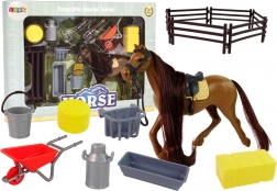 Carriola, secchio, spazzola, fieno, rastrello, forcone, ciotole per cibo e acqua e recinto – tutto per un gioco realistico in scuderia.