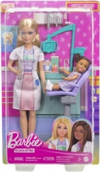 Gioca al dentista con Barbie e il suo paziente. Il set include un camice bianco, strumenti dentistici e una poltrona odontoiatrica.