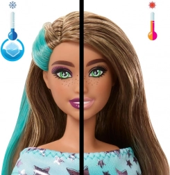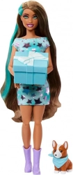BARBIE con capelli lunghi e ciocche turchesi, abito scintillante con stelle viola e scarpe alla moda. Incluso anche un cagnolino coccoloso con bandana.