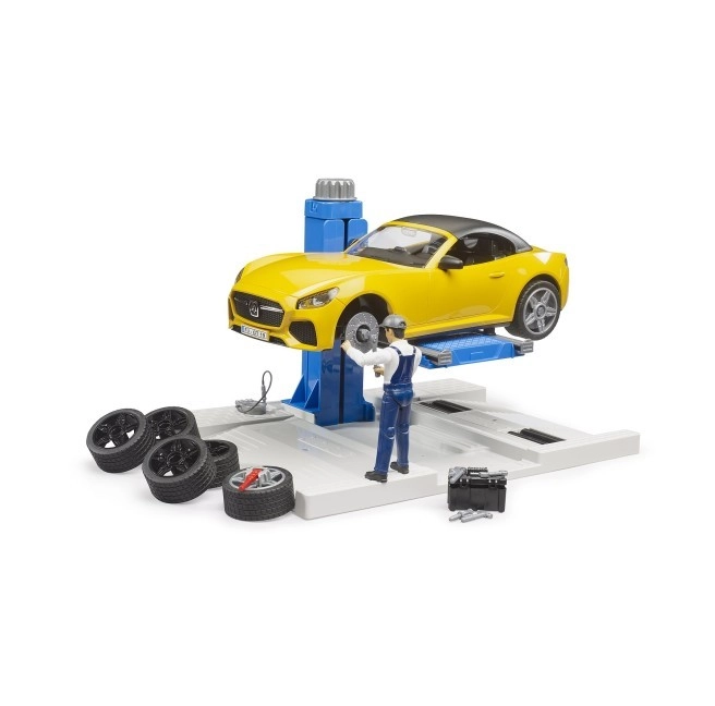 Il set BRUDER Autofficina offre ai bambini un divertimento da garage autentico con un sollevatore idraulico funzionante, su cui possono sollevare il roadster incluso ed effettuare un controllo visivo e una prova freni con visualizzazione immediata dei risultati sul monitor. Il meccanico con accessori dettagliati si occupa di cambio gomme rapido, manutenzione e misurazione della pressione degli pneumatici.