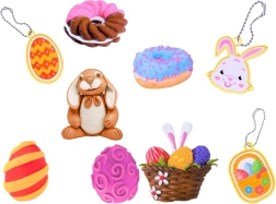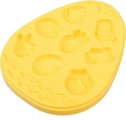 Il grande uovo con motivi di coniglietto, cestino e ovetti e due ulteriori formine con foglioline e fiorellini permettono ai bambini di creare decorazioni varie con la pasta da modellare.