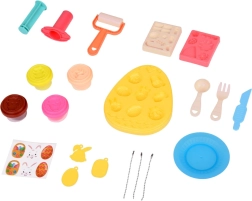 Non mancano pratiche attrezzature per un gioco realistico di pasticceria e a tavola: matterello, piattino, coltello, forchetta e cucchiaio. Un estrusore manuale crea divertenti forme a stellina con la pasta. I bambini possono decorare le creazioni con adesivi e applicarle ai 3 ciondoli double-face (testa di coniglietto, cestino, ovetto) – ideali come graziosi regali.