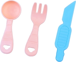Matterello, piattino, coltello, forchetta e cucchiaio favoriscono il gioco del cucinare e facilitano modellazione e “servizio” delle creazioni finite.