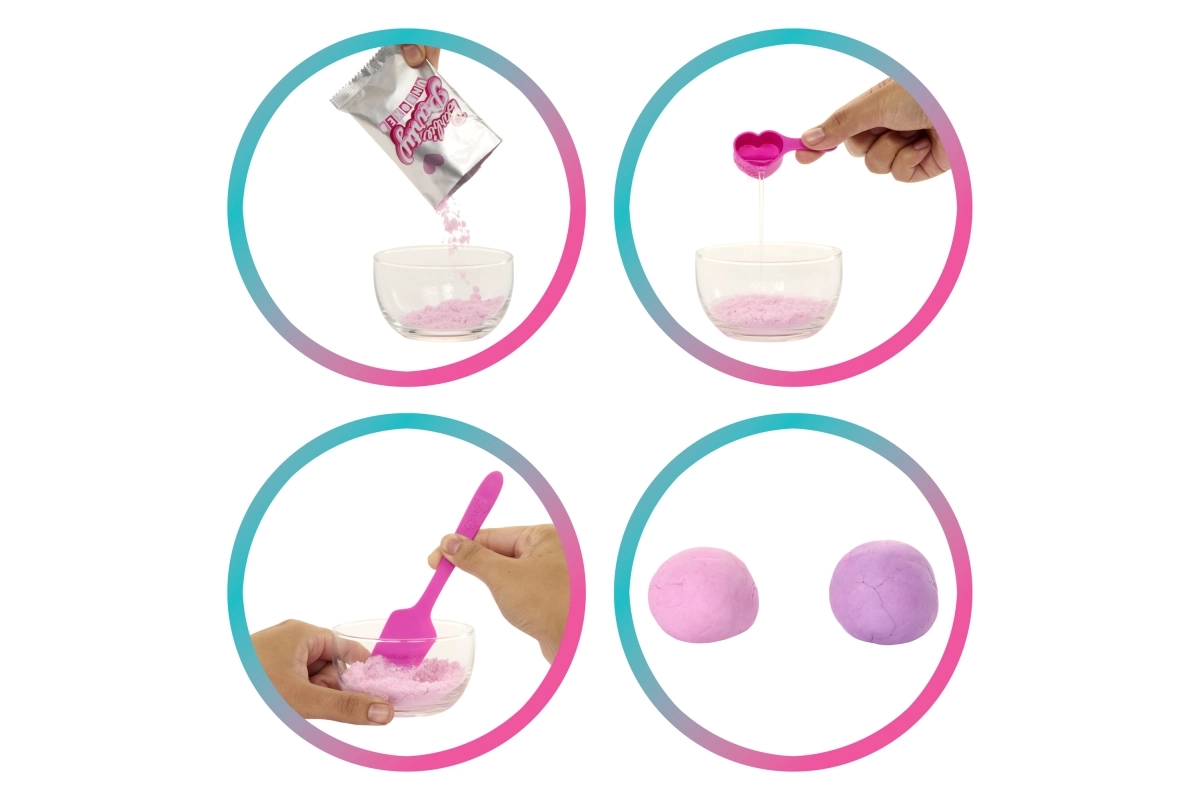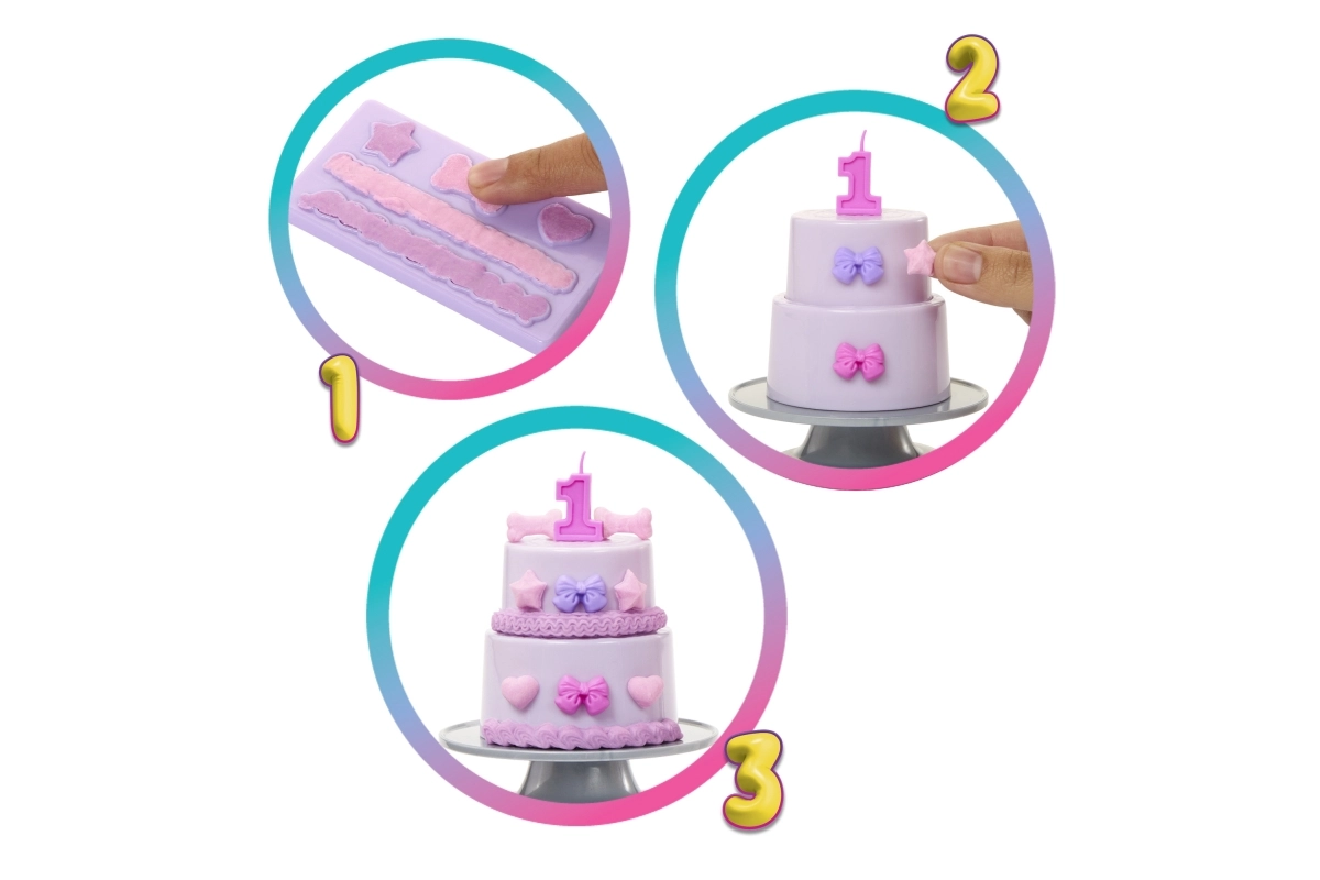 È inclusa anche la magica trasformazione del look – con acqua calda o fredda compaiono divertenti dettagli “party”. La parte creativa del set è arricchita dalla pasta modellabile con stampini per decorare la torta a due piani. Il tutto in un accattivante stile regalo che invita a scartare sorprese.