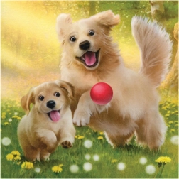 Illustrazioni di cagnolini giocherelloni nel prato motivano i bambini a comporre e sviluppano la loro immaginazione.