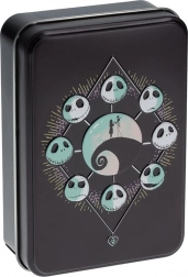 La scatola di metallo nera con il motivo di Jack Skellington e Sally è ideale per conservare e proteggere le tue carte.