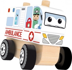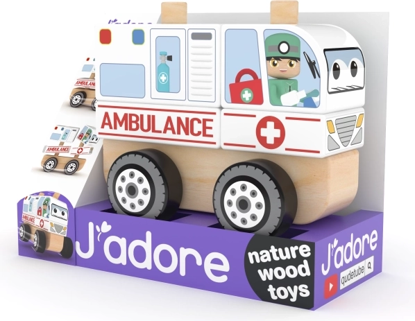 Costruisci la tua ambulanza di legno e allena le abilità mentre giochi. I blocchi colorati si infilano su 2 pioli robusti sul telaio con ruote – il montaggio semplice, passo dopo passo, favorisce concentrazione e pazienza.
