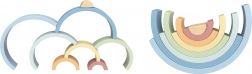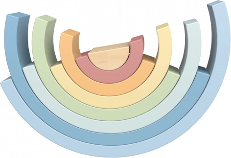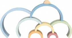 Il set include 8 pezzi semicircolari di diverse dimensioni e colori delicati, componibili in arcobaleni, ponti, tunnel e costruzioni di fantasia.