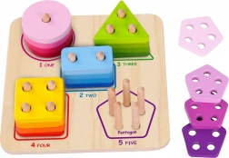 I bambini ordinano le forme colorate sui pioli corretti e nel frattempo imparano a contare 1–5 e a riconoscere i nomi inglesi delle forme sulla base.