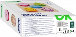 Sulla base in legno sono indicati i numeri 1–5 e i nomi delle forme in inglese, sostenendo in modo naturale le basi di una lingua straniera. Il giocattolo è rifinito con cura, sicuro e visivamente accattivante, stimolando percezione visiva e curiosità.