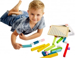 Il giocattolo è ideale per i principianti che conoscono già le cifre e hanno bisogno di esercitare conteggio, addizione e sottrazione. Legno sicuro, finemente levigato, e colori atossici garantiscono un gioco sicuro. Dopo il gioco, tutti i pezzi possono essere riposti nella lavagna, così tutto rimane sempre in ordine.