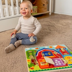 Questa tavola in legno di alta qualità offre 6 finestrelle su cerniere con diversi meccanismi – dai classici chiavistelli alle catenelle e ai ganci. I bambini allenano le dita, la concentrazione e la pazienza mentre aprono e chiudono ogni serratura per scoprire le tenere immagini degli animali.
