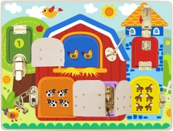 Ogni sportellino ha un meccanismo diverso – chiavistello, catenella o gancetto. I bambini rinforzano le dita giocando e imparano abilità pratiche.