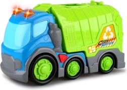 Scopri il camion della spazzatura lungo 31 cm, che offre ai bambini tanta azione e fantasia. Il giocattolo combina realistici effetti luminosi e sonori con un controllo semplice – gli effetti si attivano con il pulsante sul tetto della cabina. Le ruote libere garantiscono uno scorrimento fluido sul pavimento e una guida facile anche per i più piccoli.