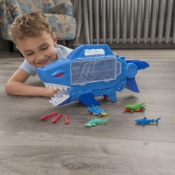 Fai scendere la macchinina lungo la rampa interna e osserva come sfreccia attraverso la bocca aperta dello squalo. Azione veloce e divertimento senza fine.