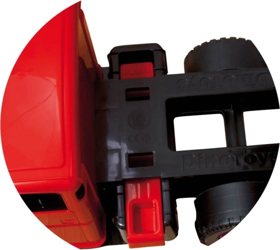 Il cassone può essere bloccato contro il ribaltamento involontario, le ruote larghe assicurano stabilità su diverse superfici e la certificazione “Giocattolo sicuro e di qualità” garantisce elevati standard di sicurezza e finitura.