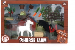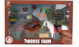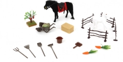 Il set include tutto il necessario per creare la propria fattoria di cavalli, comprese le figure di cavalli, strumenti agricoli e verdure.