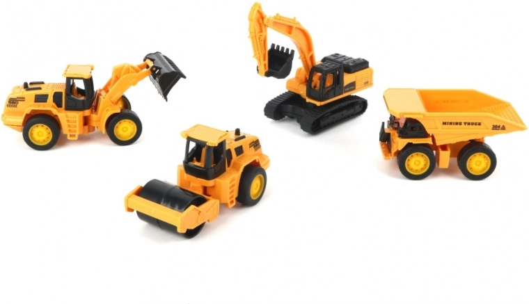 - **Set completo di 4 veicoli**: camion, ruspa, betoniera e escavatore.