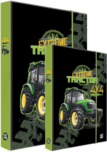 Pratico set di scatole per quaderni nei formati A4 e A5 con motivo trattore, protegge i tuoi materiali da pieghe e sporco. Grazie al rivestimento laminato resistente e alla chiusura con elastico, quaderni, fogli e accessori scolastici sono sempre al sicuro.
