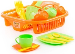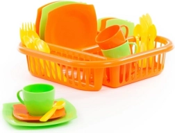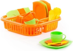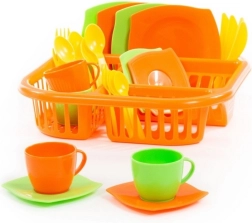 La confezione contiene vari tipi di piatti inclusi piattini, tazze, posate e ovviamente uno scolapiatti che darà ad ogni cucina un bel tocco di realtà. Non è necessario asciugare le stoviglie, basta lasciarle scolare mentre i bambini godono della loro bevanda preferita.
