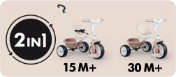 Triciclo per bambini leggero e stabile nel raffinato colore beige, dotato di telaio in metallo, asta di guida con 3 livelli di altezza, pedali antiscivolo con blocco e cintura di sicurezza. Grazie al sedile ergonomico regolabile, alle ruote silenziose e al pratico cestino ribaltabile, è ideale per le prime pedalate e per una guida confortevole da parte dell’adulto.