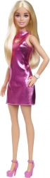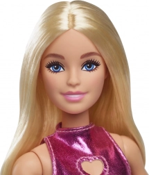La bambola Barbie ha lunghi capelli biondi e un abito rosa, magnifico e dolce grazie al materiale metallizzato e al taglio a cuore.