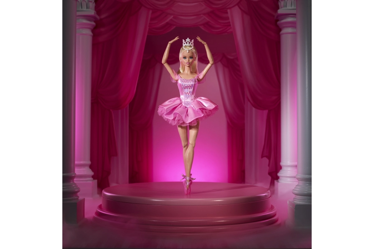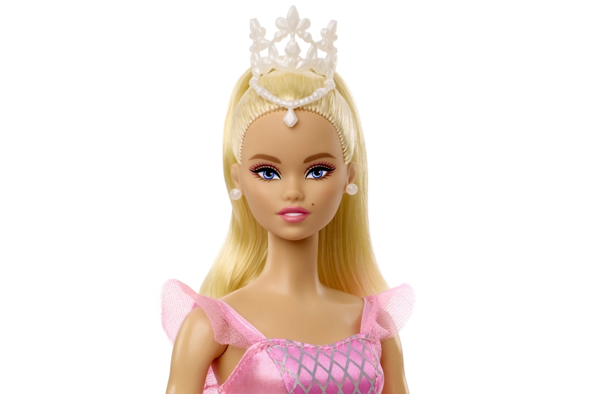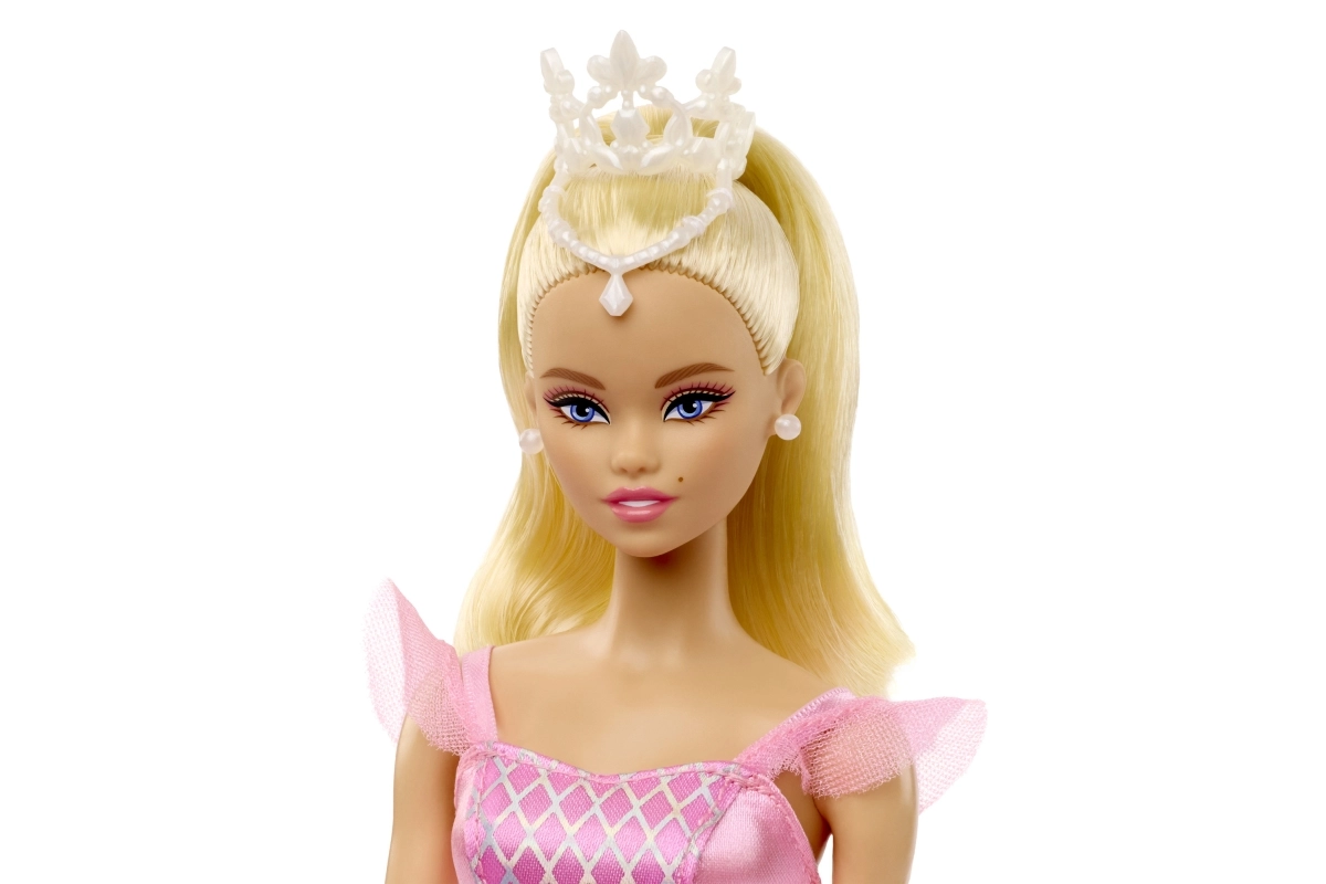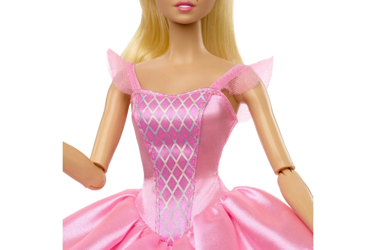 Tutù rosa satinato con volant trasparenti, corpetto decorato e tiara bianca donano alla bambola un vero tocco da palcoscenico – ideale per grandi prime e per l’esposizione.