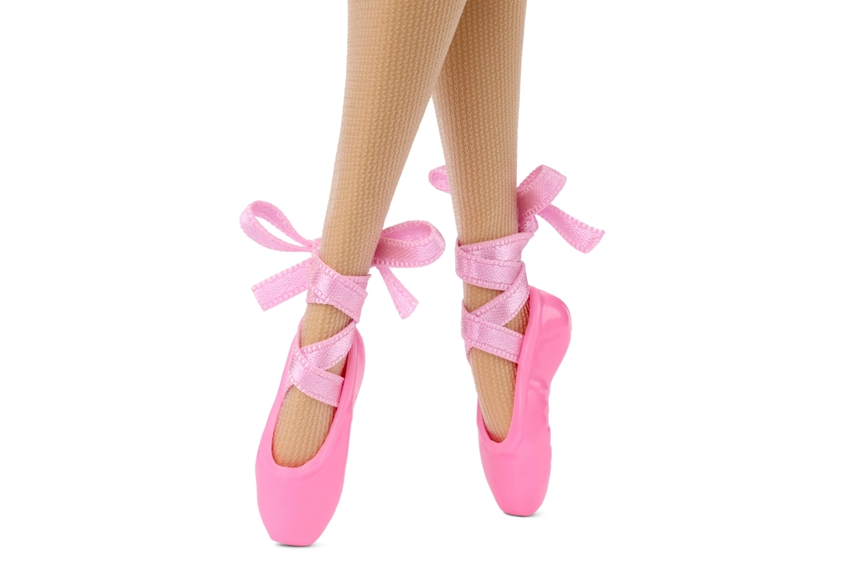 Le scarpette rosa con nastri effetto tengono perfettamente al piede della bambola e completano il look da ballerina fin nei minimi dettagli.