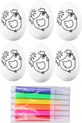 - Tutto nel set – 6 uova + 6 pennarelli colorati (giallo, arancione, rosso, blu, rosa, verde).