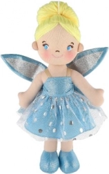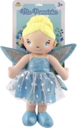 La bambola è vestita con un abito azzurro con ali scintillanti, dandole un vero aspetto da favola.