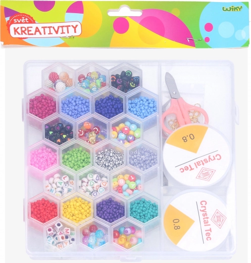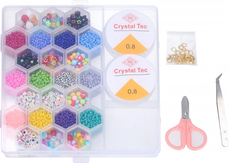 Scopri le tue possibilit0 creative con il nostro set di perline, che contiene tutto il necessario per i tuoi progetti. Il set include perline, cordini, forbici, chiusure e pinzetta.