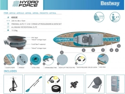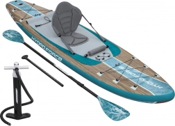 - Tavola, sedile con schienale, poggiapiedi, pagaia, pompa manuale, leash a sgancio rapido, zaino, kit di riparazione